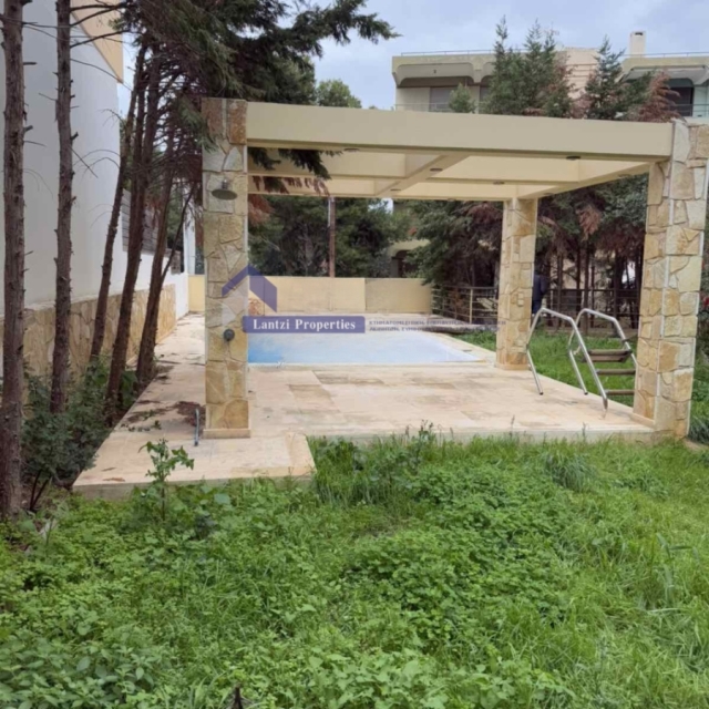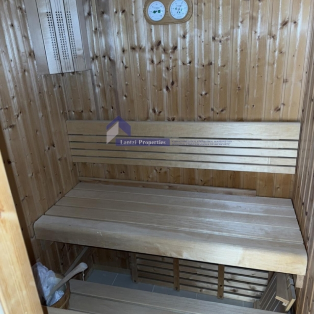 It has 2 levels. On the 1st level we find a Living Room with Fireplace - Dining Room, 1 Kitchen Room with excellent quality Corrian furniture, German appliances & multiple stoves of excellent quality, Laundry room, as well as 4 Master Bedrooms and wardrobes. It is accompanied by an excellent surrounding area with a garden of 400 sq m. , Sauna area & swimming pool of 40 sq m. (4*10 & depth starting from 1.3 m. reaching 3 m.). The pool area has a Shower as well as electrical facilities (data & smartphone charger).